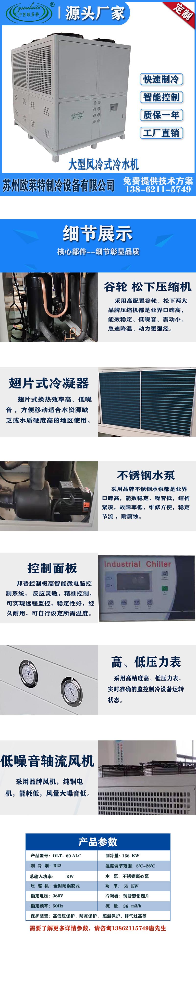 60HP風(fēng)冷式冷水機(jī),168KW制冷量冷卻機(jī),蘇州風(fēng)冷式冷凍機(jī)廠家--蘇州歐萊特制冷設(shè)備有限公司,廠家直銷,價(jià)格優(yōu)惠,歡迎來(lái)電洽談。